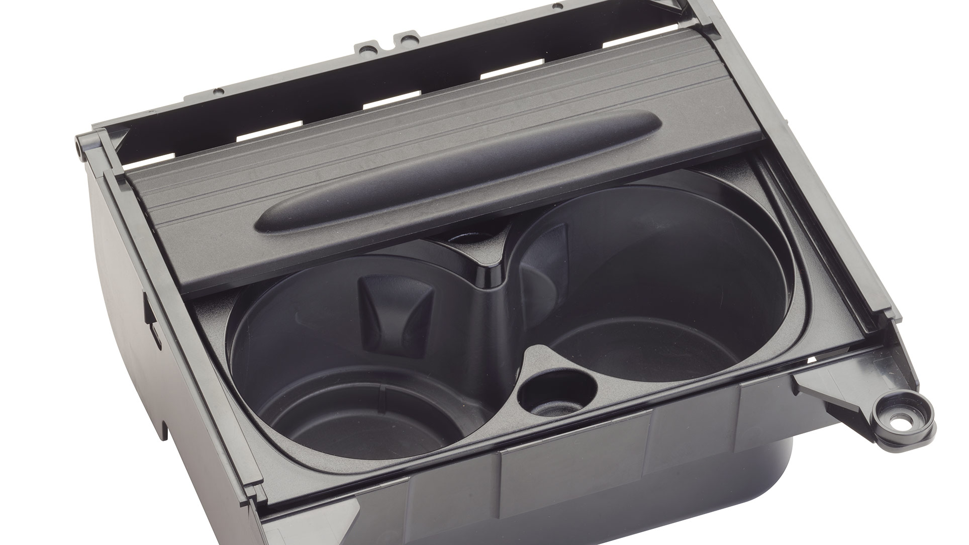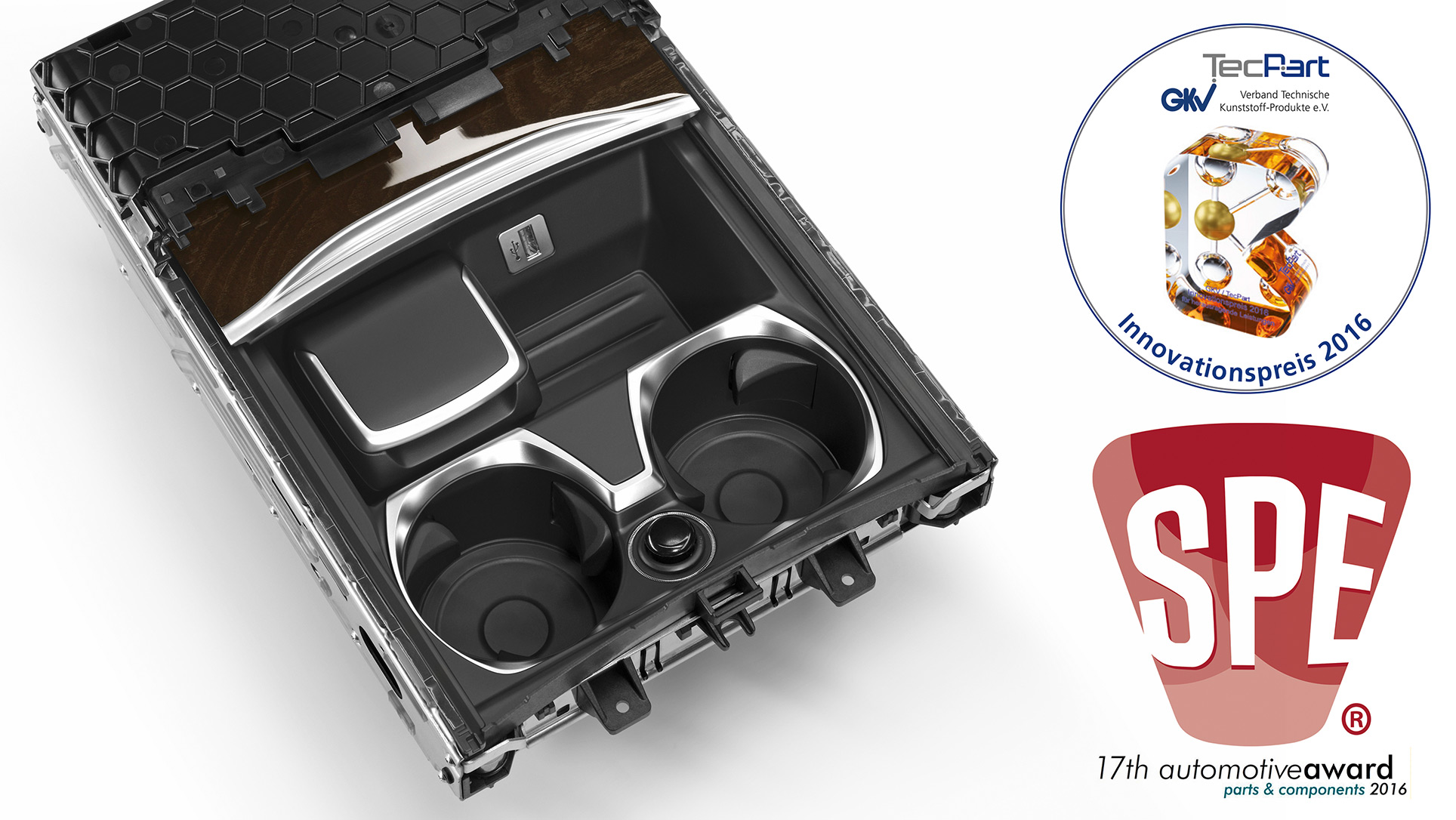 2016: Innovation im Auto-Interieur: Mittelkonsolen-Ablagefach/Cupholder-Einheit mit doppellagigem 2-Stufen-Schiebedeckel